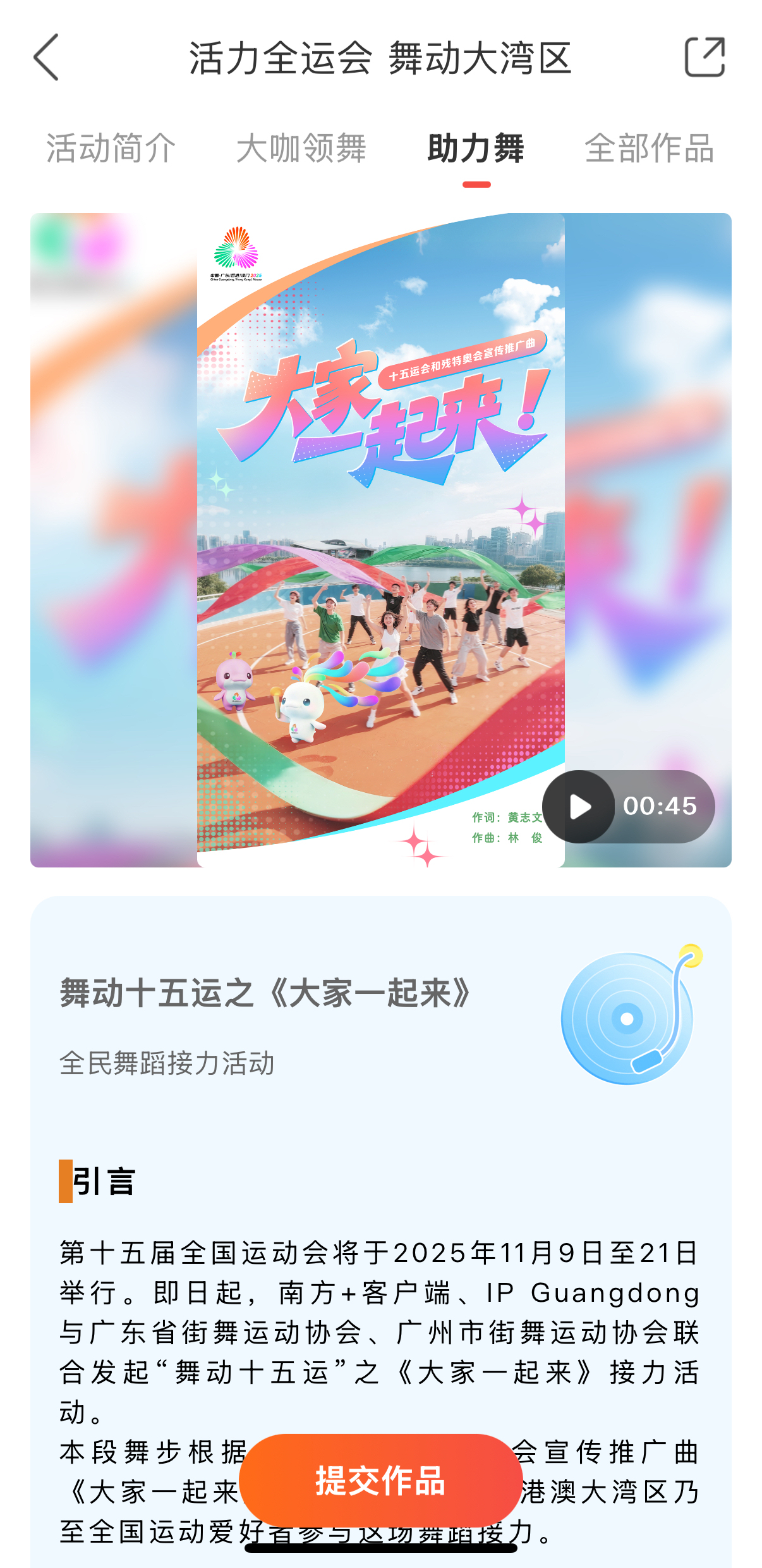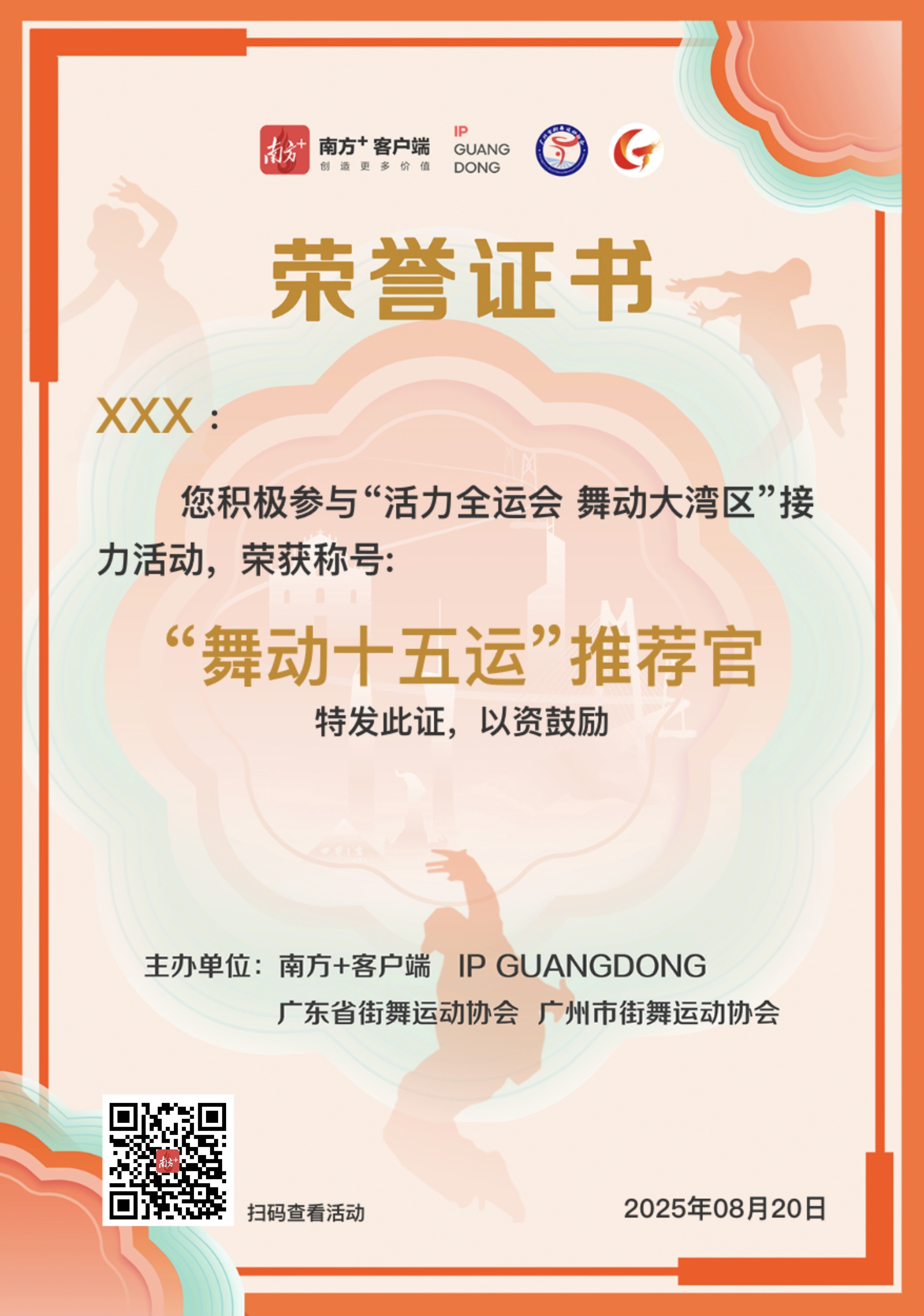 即日起,由南方+、IP GuangDong与广东省街舞运动协会、广州市街舞运动协会联合发起的“舞动十五运”短视频接力活动升级上新,结合十五运会和残特奥会宣传推广曲《大家一起来》,发动新一轮舞蹈短视频征集,以“传唱跳”一体的文化标识,邀请全民参与、共迎盛会,为赛会注入澎湃活力。
